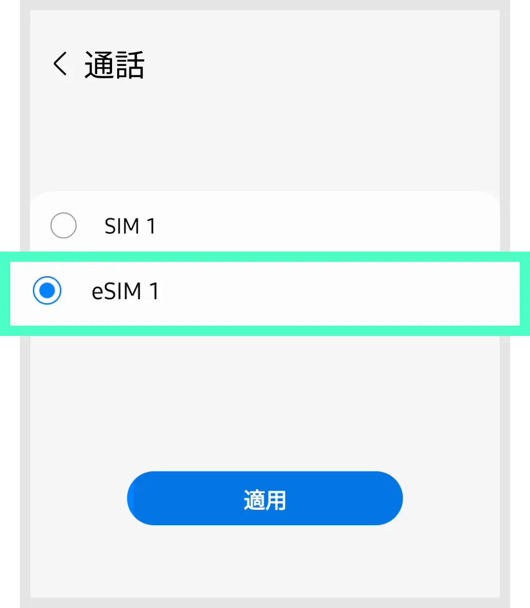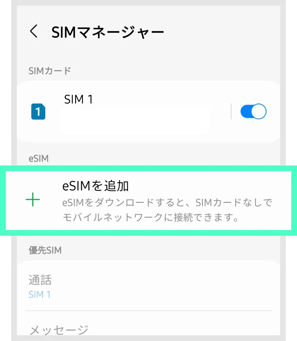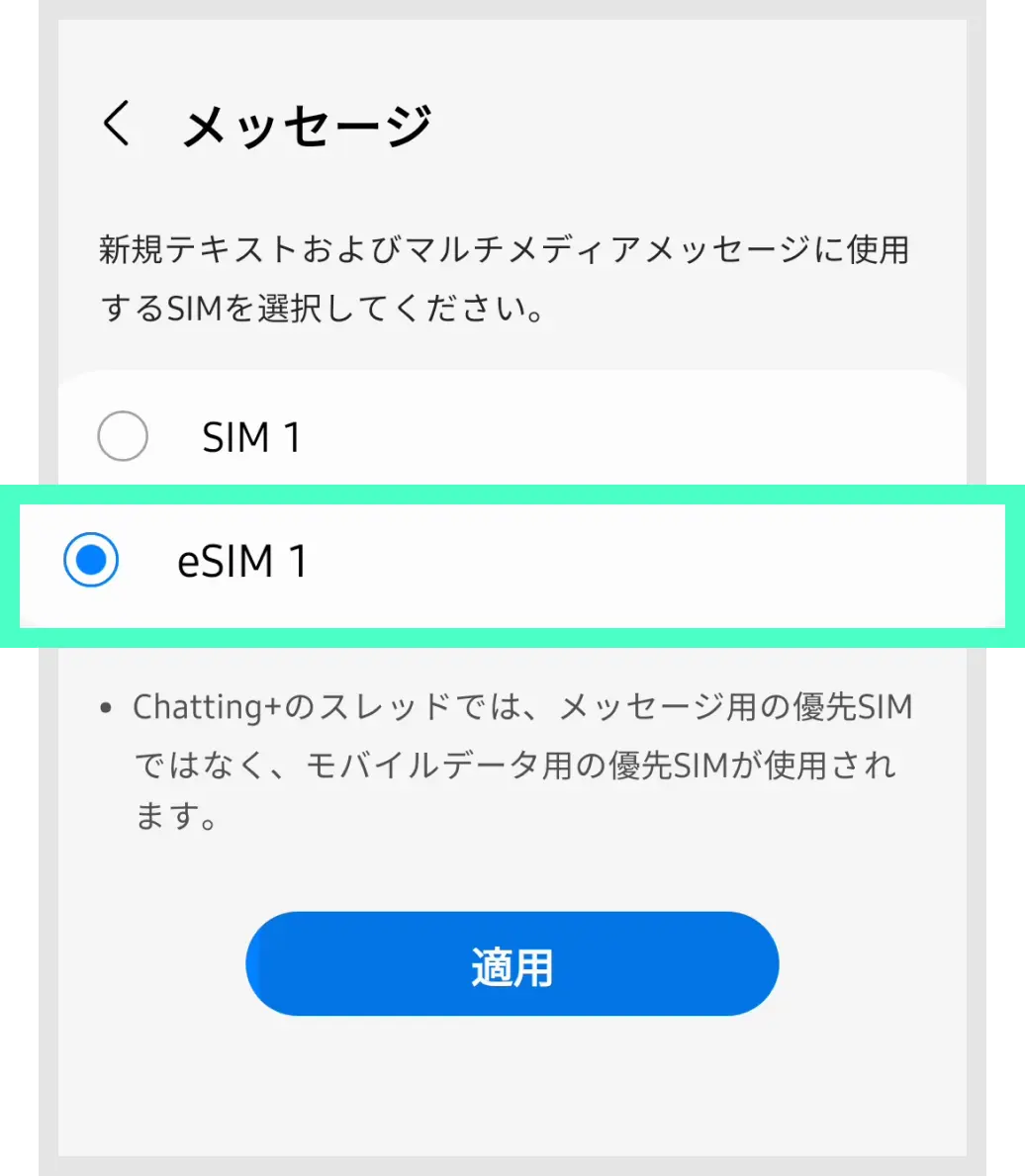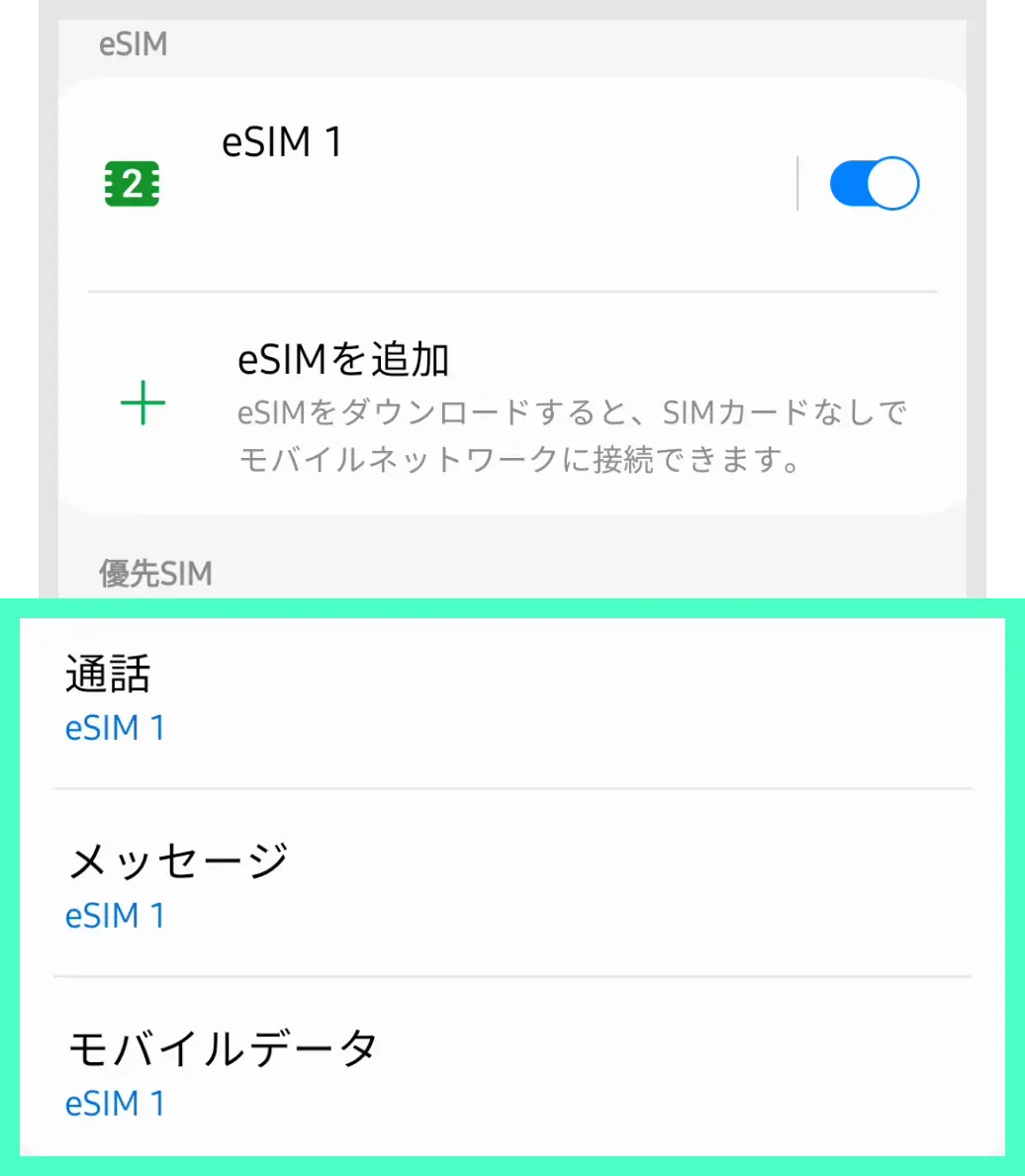 「通話」「メッセージ」「モバイルデータ」がeSIMになっていることを確認してください