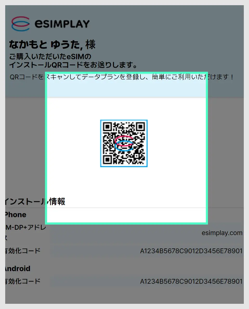 QRコードはメールまたはesim.co.jpのアカウントから入手できます。